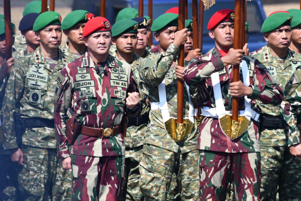 Presiden Republik Indonesia Prabowo Subianto meresmikan enam Komando Daerah Militer (Kodam) baru, 20 Brigade Infanteri Teritorial Pembangunan (Brigif TP), dan 100 Batalyon Infanteri Teritorial Pembangunan (Yonif TP) dalam Upacara Gelar Pasukan Operasional dan Kehormatan Militer di Lanud Suparlan, Pusdiklatpassus, Batujajar, Bandung, Jawa Barat, Minggu (10/8/2025). Upacara yang diikuti tiga matra TNI ini sekaligus menjadi momen peresmian sejumlah satuan operasional baru lainnya di jajaran TNI.