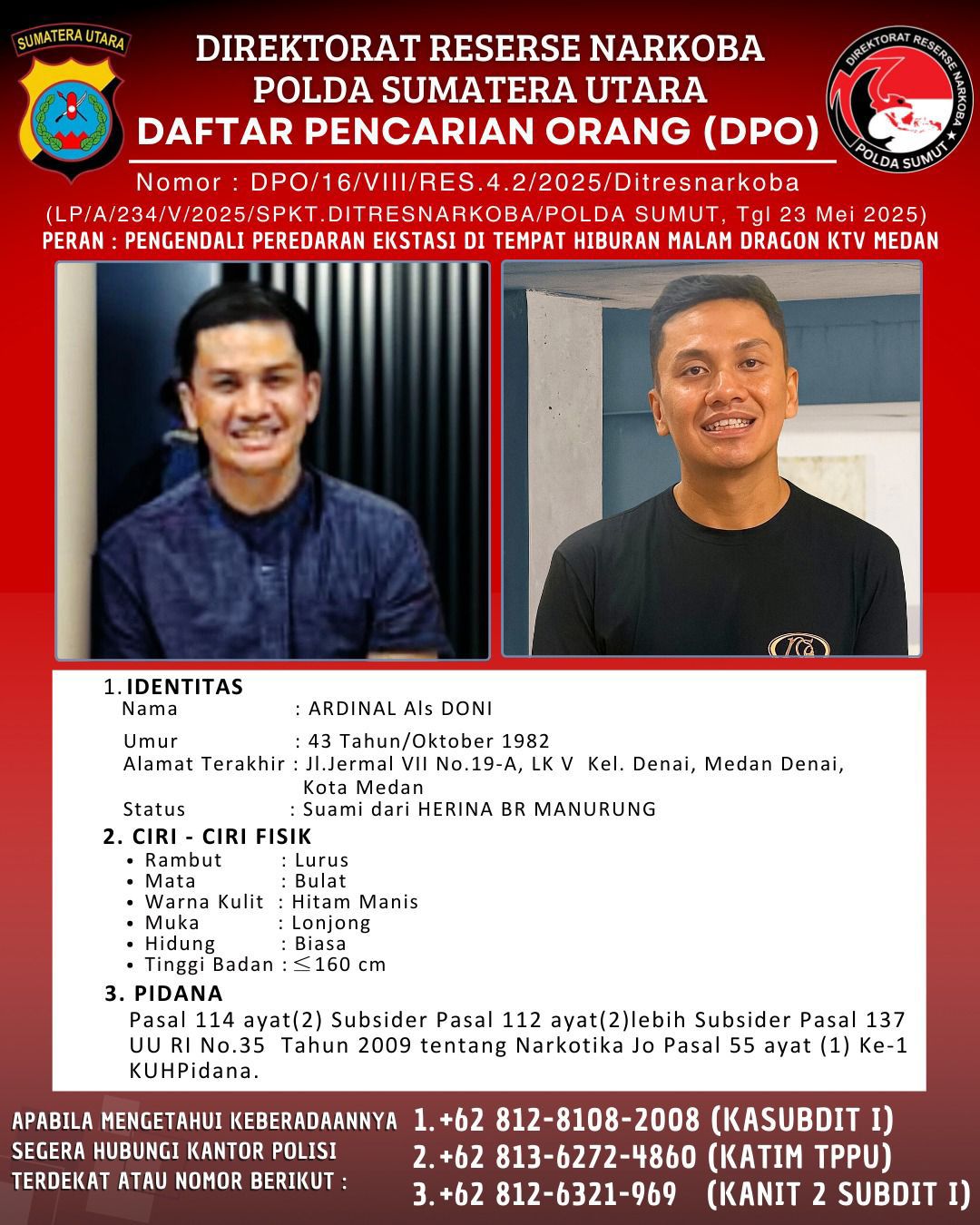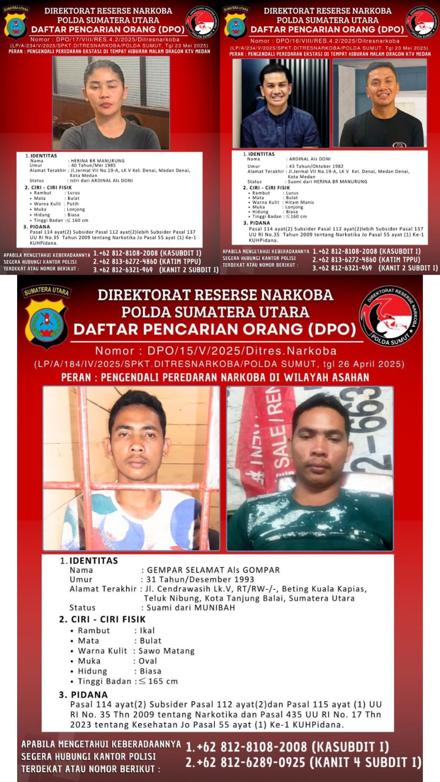 Bagi masyarakat maupun petugas yang mengetahui keberadaan para DPO, segera melakukan pengawasan dan penangkapan. Informasi dapat disampaikan kepada Ditresnarkoba Polda Sumut melalui kontak berikut: