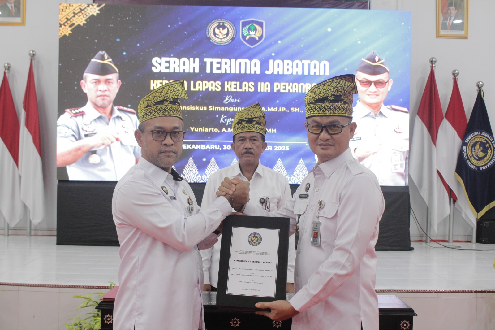 Yuniarto juga menyampaikan apresiasi setinggi-tingginya kepada Erwin Fransiskus Simangunsong atas dedikasi dan kepemimpinannya selama menjabat sebagai Kalapas Pekanbaru. “Mari kita lanjutkan fondasi yang telah dibangun adinda Erwin, menyatukan langkah, menyongsong masa depan dengan semangat baru, serta menjadikan Lapas Pekanbaru sebagai Lapas yang unggul, profesional, dan berintegritas,” ajak Kalapas.