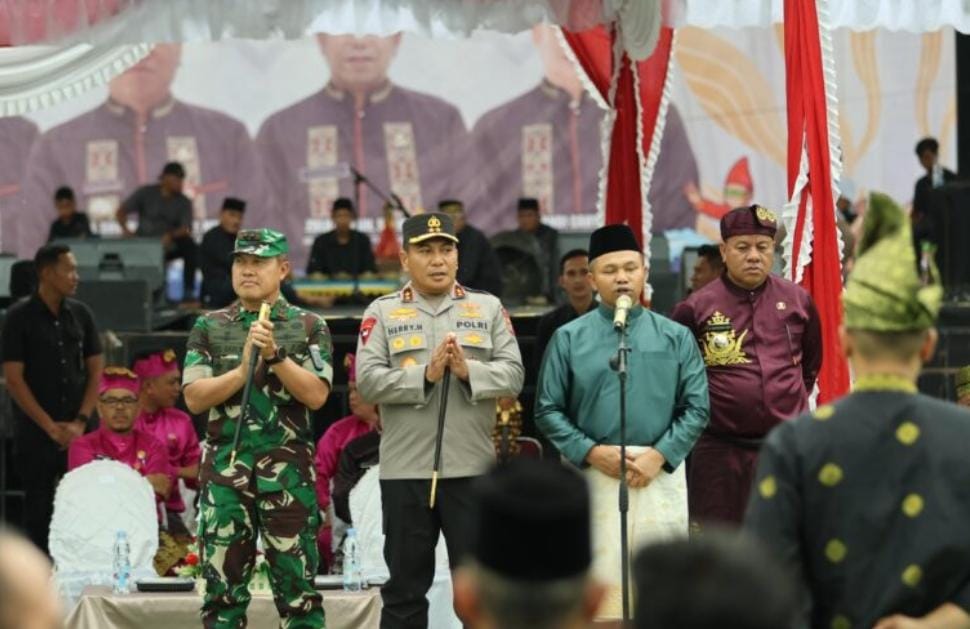 Acara yang berlangsung khidmat ini turut dihadiri oleh para pejabat tinggi, di antaranya Kapolda Riau Irjen Pol Dr. Herry Heryawan, S.I.K., M.H., M.Hum, Pangdam XIX/TT Mayjen TNI Dr. Agus Hadi Waluyo, S.A.P., M.M., CHRMP, Danrem 031/WB Brigjen TNI Jarot Suprihanto, Bupati Kuantan Singingi Dr. Suhardiman Amby, A.K., M.M., serta Kapolres Kuansing AKBP R. Ricky Pratidiningrat, S.I.K., M.H. bersama jajaran Forkopimda dan tokoh adat Kabupaten Kuansing.
