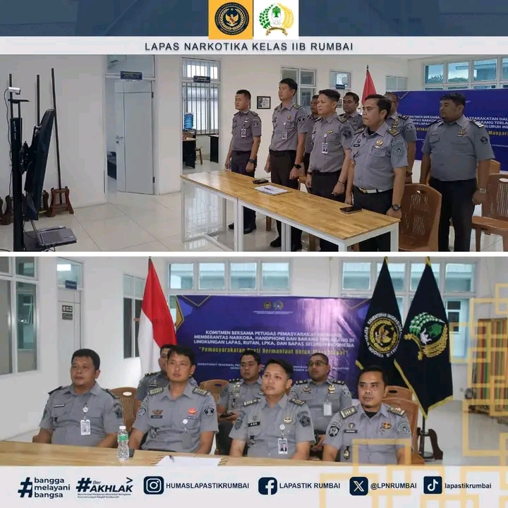 Lembaga Pemasyarakatan Narkotika Kelas IIB Rumbai Melaksanakan Penandatangan Komitmen Bersama Petugas Pemasyarakatan Dalam Memberantas Narkoba, Handphone dan Barang Terlarang di Lingkungan Lapas, Rutan, LPKA dan Bapas Seluruh Indonesia, Senin (20/10/2025)