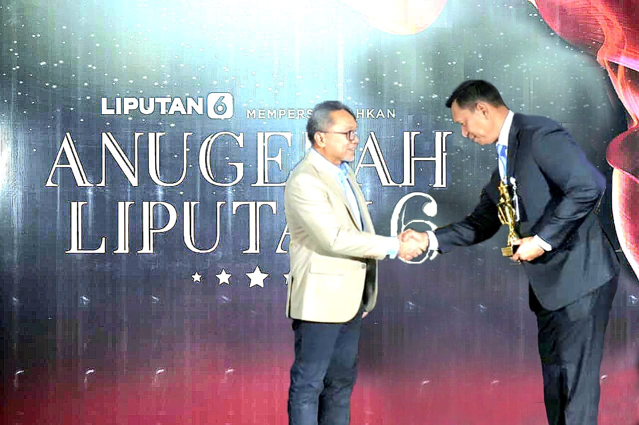 Menteri Koordinator Bidang Pangan, Zulkifli Hasan, menyerahkan penghargaan kepada Direktur Utama Perum BULOG, Ahmad Rizal Ramdhani, dalam acara puncak Anugerah Liputan6 Tahun 2025 yang digelar di The Hall, SCTV Tower Senayan City, Jakarta, Kamis (16/10/2015).