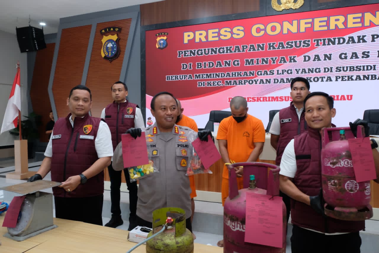 Direktorat Reserse Kriminal Khusus (Ditreskrimsus) Polda Riau berhasil mengungkap praktik pengoplosan dan pemindahan gas LPG bersubsidi ke tabung non-subsidi di Kota Pekanbaru.