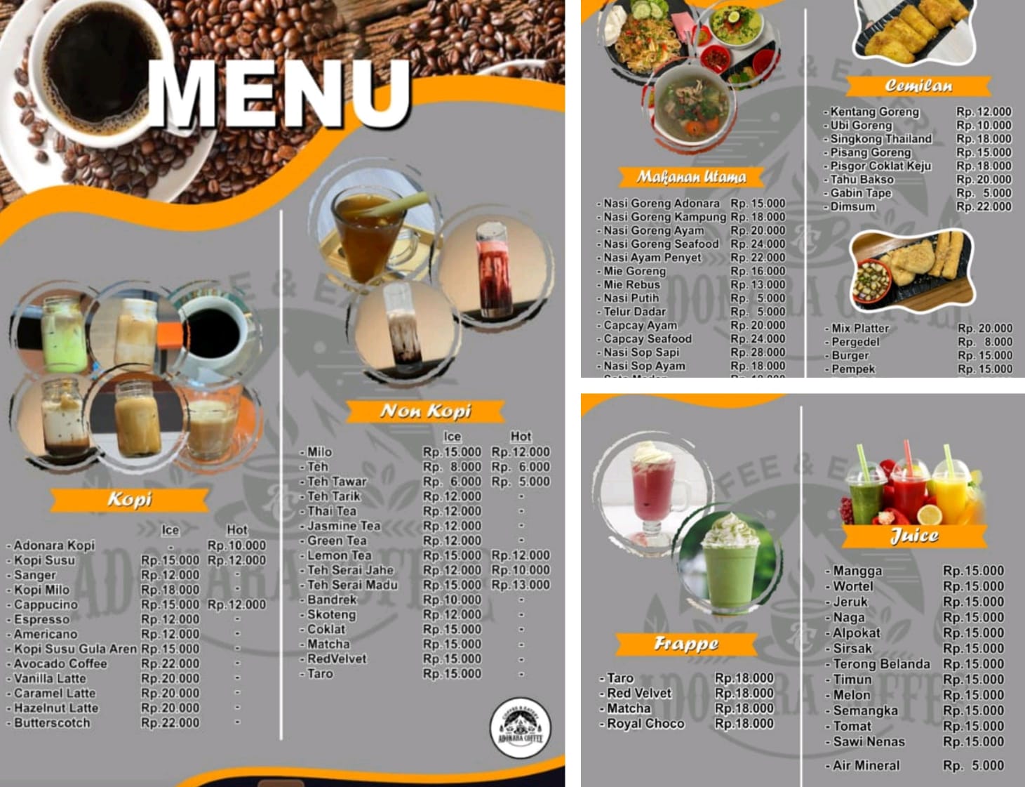 Menu yang disajikan adalah Menu Makanan dan Minuman Nusantara. Best seller Makanan nya adalah Nasi Goreng Adonara dan Minuman adalah Kopi Adonara NTT. Yakni Bubuk Kopi yang di olah secara Tradisional. Lebih nikmat adalah Kopi Aceh, tapi Kopi Adonara tidak kalah nikmat cita rasanya ketika diseruput.