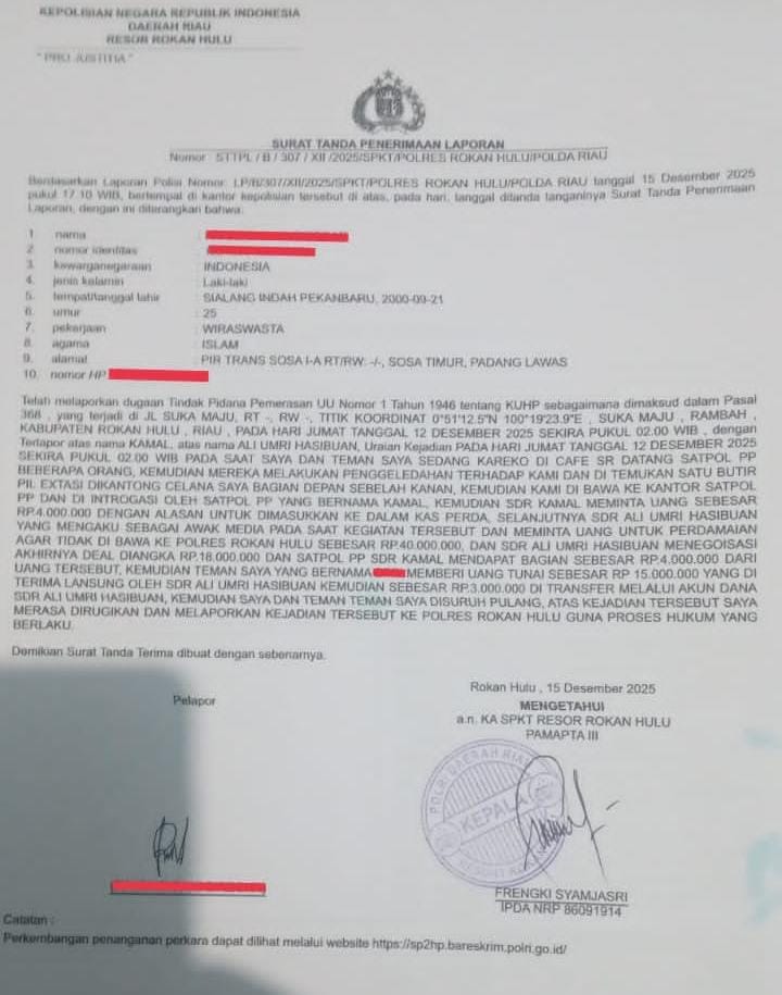 Saat ini korban telah melaporkan peristiwa yang dialaminya ke Polres Rohul, dengan mengantongi STTPL/B/307/Xll/SPKT/POLRES ROKAN HULU/POLDA RIAU.