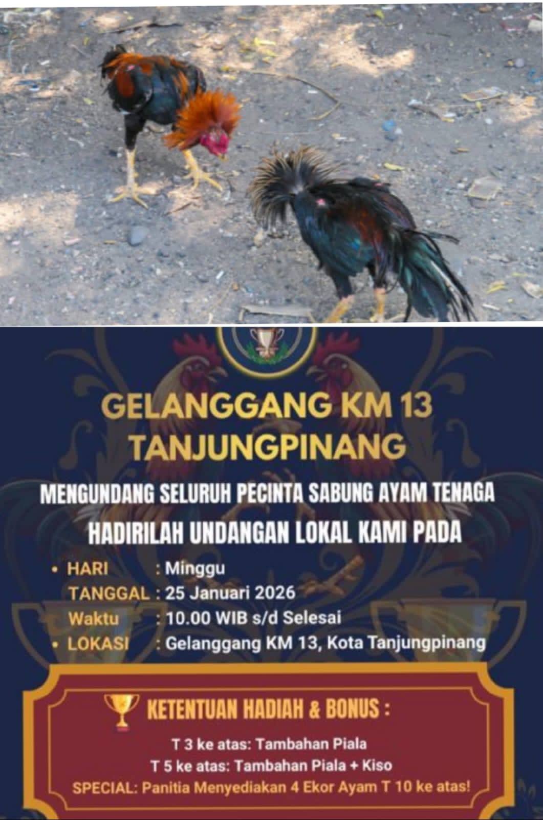 🇲🇨✌️Mentengnews.com – Tanjungpinang, Kepri: Aktivitas judi sabung ayam berskala besar diduga masih bebas beroperasi di wilayah Km 13 Tanjungpinang, Kepulauan Riau, bahkan disebut-sebut berlangsung secara terbuka dengan kemasan festival besar-besaran dan penyebaran undangan resmi dari pihak pengelola.