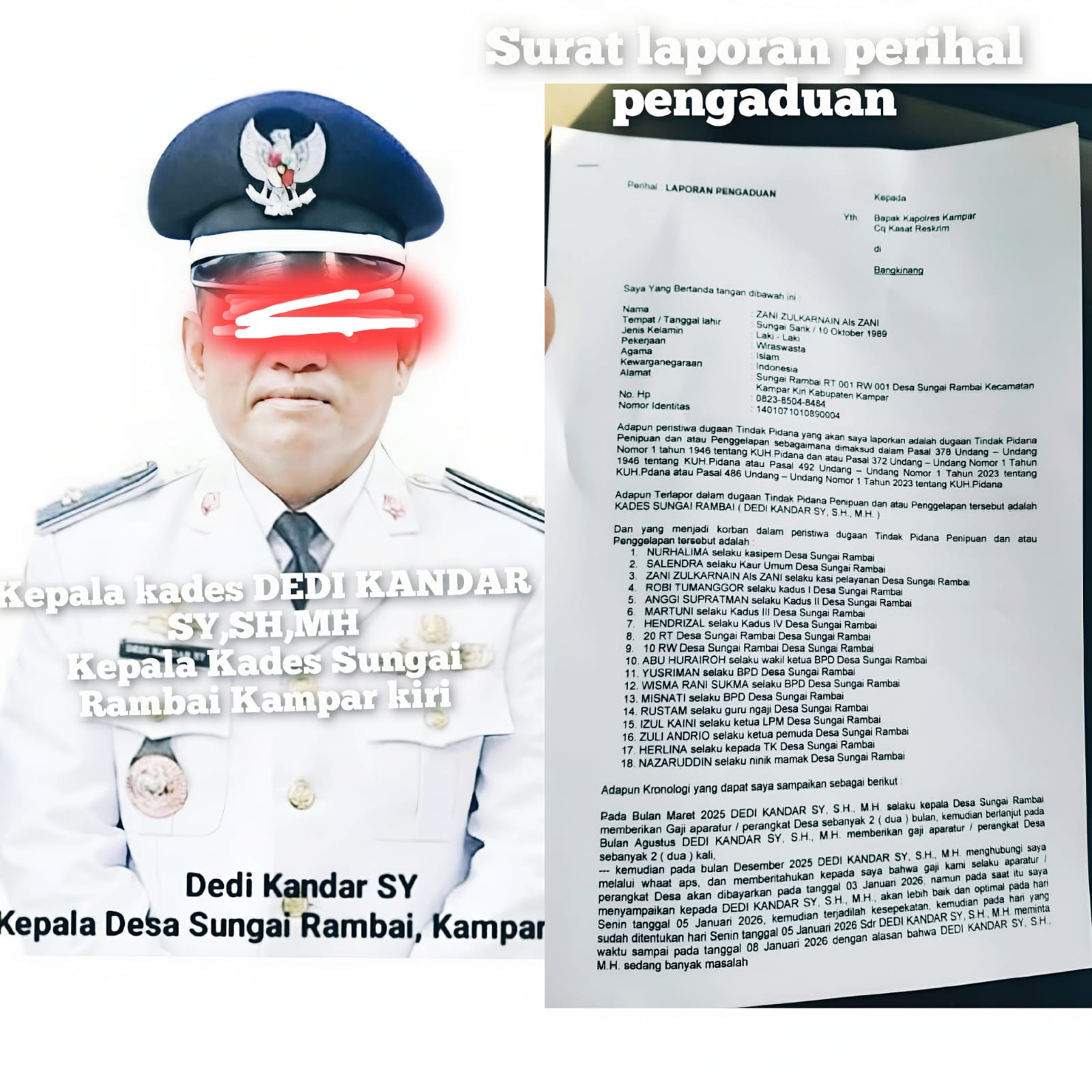 🇮🇩✌️Mentengnews.comKampar, Riau – Kepala Desa Sungai Rambai, Kecamatan Kampar Kiri, Kabupaten Kampar, Dedi Kandar, SY., SH., MH., dilaporkan ke aparat penegak hukum atas dugaan penggelapan gaji perangkat desa dan anggota Badan Permusyawaratan Desa (BPD) dengan total nilai lebih dari Rp200 juta untuk periode 2025–2026.