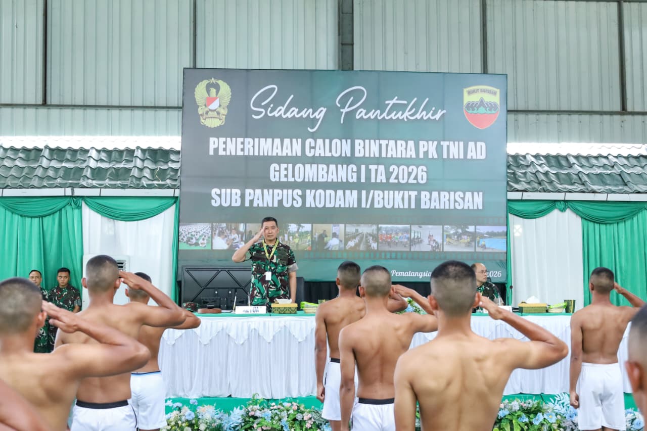 🇮🇩✌️Mentengnews.com – Pematangsiantar – Pangdam I/Bukit Barisan Mayjen TNI Hendy Antariksa memimpin kegiatan Sidang Pantukhir Pusat Penerimaan Calon Bintara (Caba) PK TNI AD Gelombang I TA 2026 tingkat Sub Panpus Kodam I/BB di Lapangan Tennis Indoor Rindam I/BB, Pematangsiantar, Kamis (19/2/2026). Setibanya di Rindam I/BB, Pangdam menerima laporan dan penghormatan jajar sebelum kegiatan dimulai.