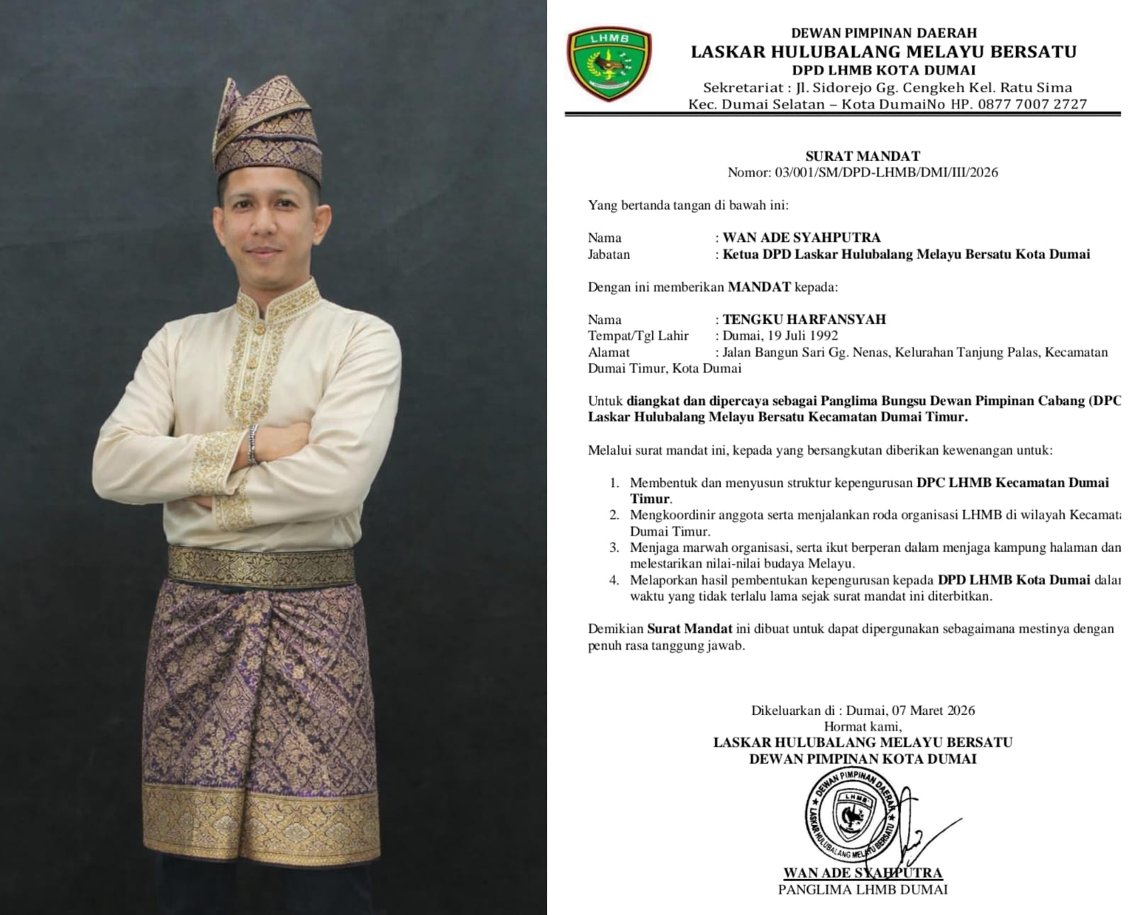🇮🇩✌️Mentengnews.comDumai: Dewan Pimpinan Daerah (DPD) Laskar Hulubalang Melayu Bersatu (LHMB) Kota Dumai secara resmi memberikan surat mandat kepada **Datok Tengku Harfansyah** untuk menjabat sebagai Panglima Bungsu Dewan Pimpinan Cabang (DPC) LHMB Kecamatan Dumai Timur.