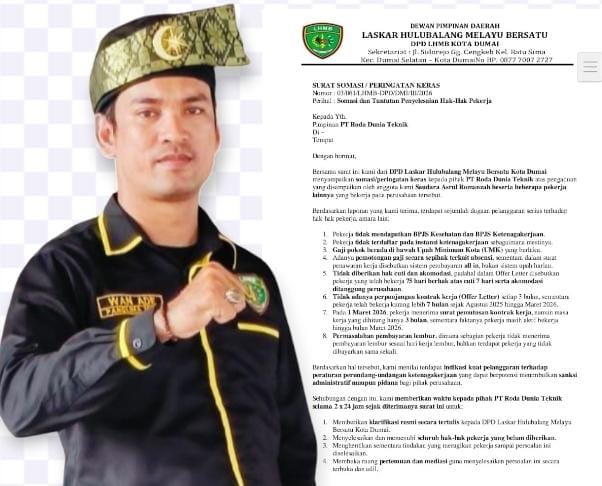 🇮🇩✌️Mentengnews.comDumai, Maret 2026 — Dewan Pimpinan Daerah (DPD) Laskar Hulubalang Melayu Bersatu (LHMB) Kota Dumai secara resmi melayangkan somasi kepada perusahaan kontraktor PT Roda Dunia Teknik (RDT) yang merupakan mitra kerja PT Pertamina (Persero) RU II Dumai. Somasi tersebut dilayangkan setelah LHMB menerima pengaduan dari salah satu anggotanya yang bekerja di perusahaan tersebut terkait dugaan pelanggaran hak-hak pekerja.