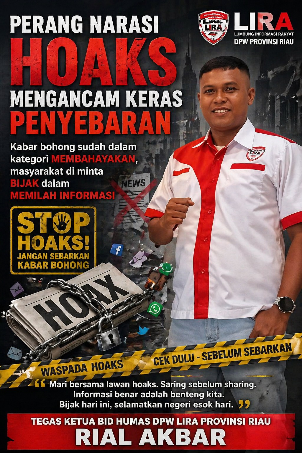 Ketua Bidang Humas DPW Lumbung Informasi Rakyat (LIRA) Provinsi Riau, Rial Akbar ,menegaskan bahwa dampak hoaks di Indonesia sudah sangat nyata dan berbahaya.